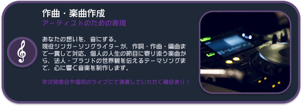 ボイストレーニング・ボーカルレッスン・ギター・ベース・楽曲制作を行い、対面・オンラインで音楽レッスンを提供している。